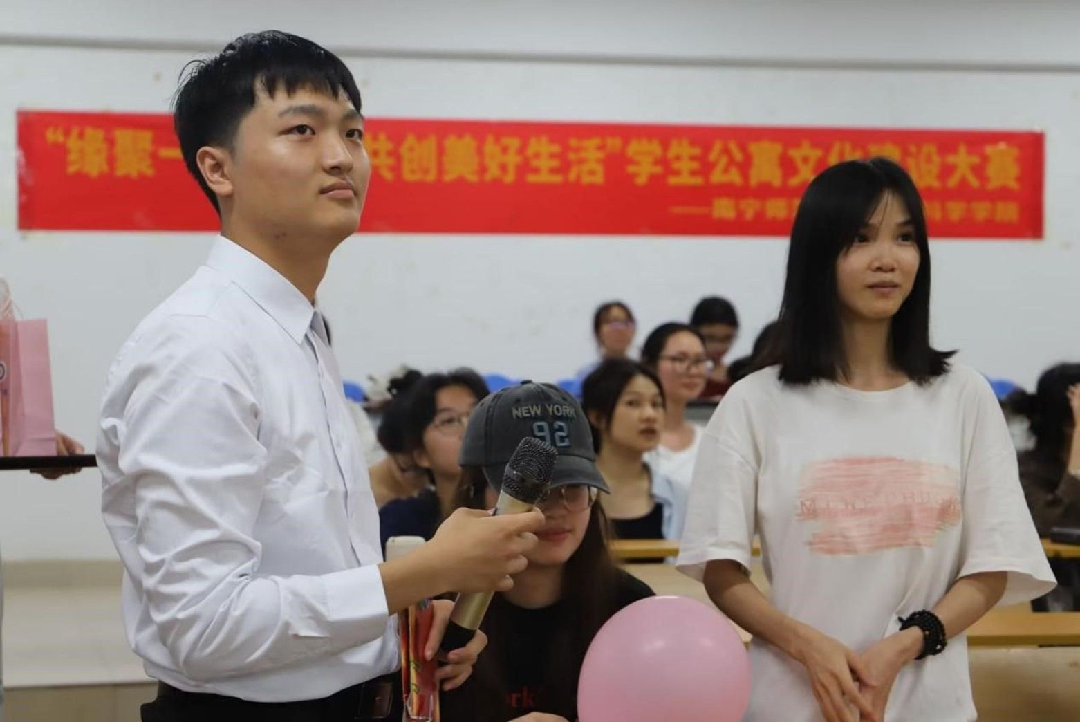 比赛在两位主持人亲切的问候中拉开了序幕,首先主持人向同学们介绍了比赛形式、比赛规则。1号宿舍在介绍本宿舍成员后通过情景剧形式向大家展示广西各地特色文化,表达出“即使宿舍每个人来自不同地区,但相聚就是一家人”的宿舍理念;2号宿舍通过情景剧形式演绎日常生活可能会出现的矛盾情景,体现出“每个人都要相互尊重才能和谐共处”的宿舍理念等等,在宿舍展示环节,各宿舍通过不同形式来展现各宿舍特色、宿舍公约、宿舍文化等……
