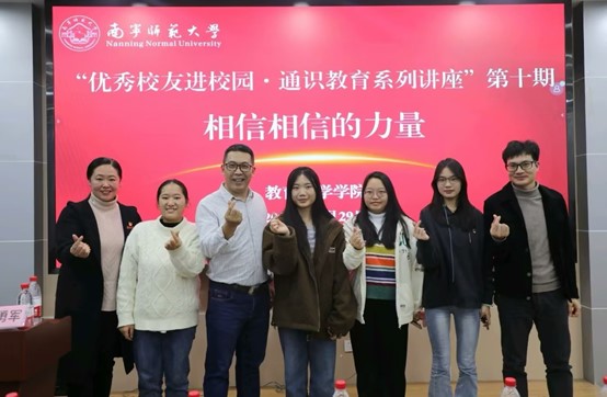 落实立德树人的根本任务,践行“德才并育,知行合一”的校训精神,帮助学生增强处理,教育科学学院于2023年12月29日在五合校区理楼1003会议室举行了以《相信相信的力量》为主题的“优秀校友进校园·通识教育系列讲座”活动。讲座邀请教育科学学院2006级教育经济与管理专业优秀校友、美丽南方青瓦房党支部书记兼副总、广西社会心理学会副会长赵勇军主讲。学院党委书记庞芳,院长李强,2001级校友韦国才出席了讲座。本次讲座由学院党委副书记谢珊主持,本科生各班90多名代表参加。
