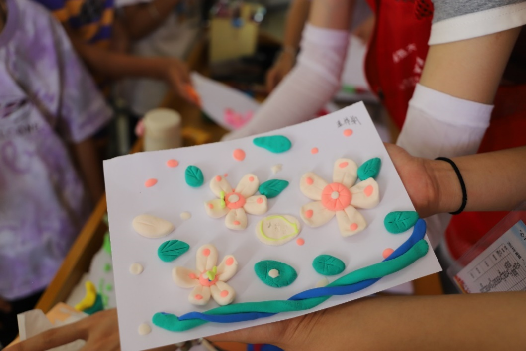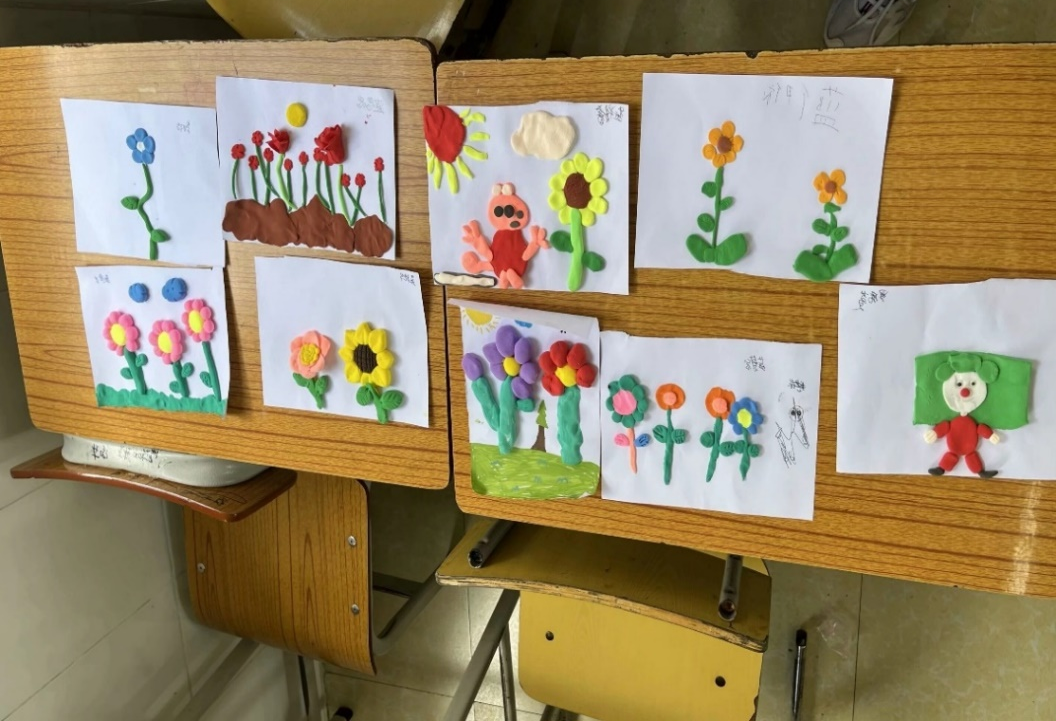班会结束后,迎来了夏令营的第一堂课。支教组成员以丰富的手工教学经验和亲和力,引领孩子们进入了一个充满想象和创造的空间。在志愿者悉心的指导下,孩子们运用彩泥,塑造出一朵朵生机勃勃的小花。完成作品后,孩子们兴奋的站上讲台,向大家展示自己的泥塑花朵。其中,两位特别被邀请的孩子详细描述了自己的创作灵感来源以及在制作过程中遇到的挑战和克服方法,加深了孩子们之间的互相了解,也激发了孩子们对色彩运用和立体造型的讨论。这不仅是一次艺术与美的邂逅,更是一堂生动的生命教育课,让孩子们学会发现自己独特的美,学会在平凡的生活中发现不凡,用双手创造属于自己的奇迹。