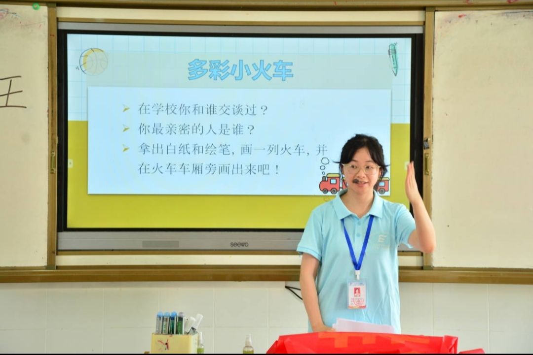 在人际关系心理课堂中,支教组的队员首先引导同学们观看一则小短片并让学生思考短片中发生了什么故事,由此引入课堂主题——人际关系。紧接着让同学们画出自己的“多彩小火车”,描绘自己的人际关系图,并在小火车上画出各种表情来表示自己对这些人际关系有过的情绪,同学们与支教老师们共同探讨解决人际关系问题的方法。在课堂的最后,支教老师们为同学们带来了一些有趣的心理学小知识,丰富了学生们的知识理论体系。