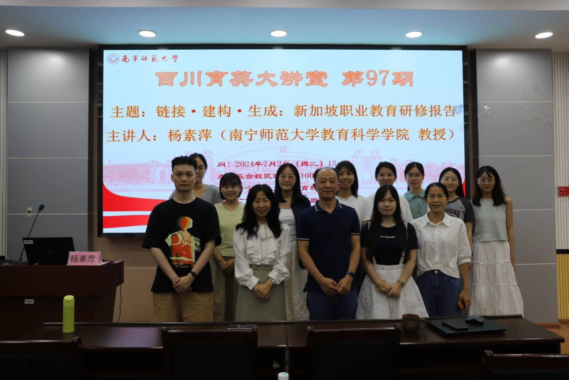 为了解新加坡职业教育先进理念和实践经验、拓展师生的国际视野、提高东盟国家教育理论研究和实践水平,7月2日下午,由教育科学学院主办、广西教育现代化与质量监测研究中心承办的百川育英大讲堂系列第97期讲座顺利举行,杨素萍教授作题为《链接·建构·生成:新加坡职业教育研修报告》的专题讲座。本次讲座由教育科学学院副院长徐延宇研究员主持。