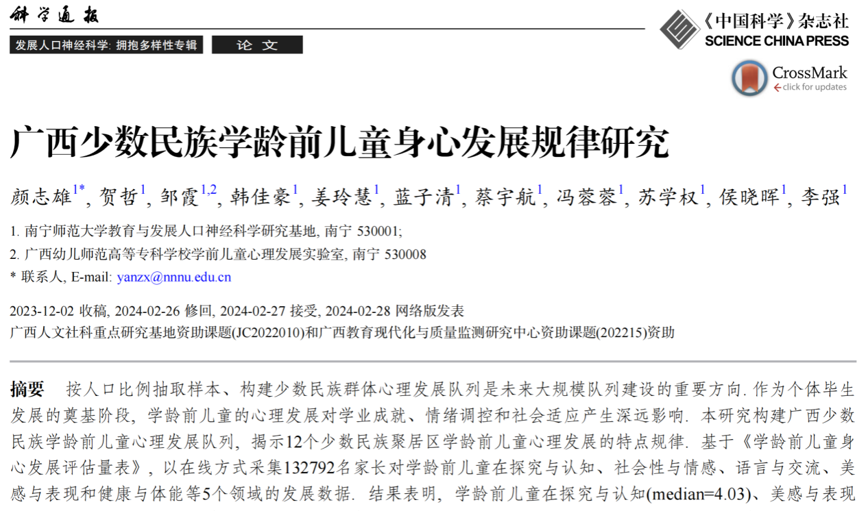 近日,我校教育科学学院颜志雄教授团队以必威西汉姆联官网为第一署名单位在《科学通报》发展人口神经科学: 拥抱多样性专辑上发表题为“广西少数民族学龄前儿童身心发展规律研究”的研究论文。
