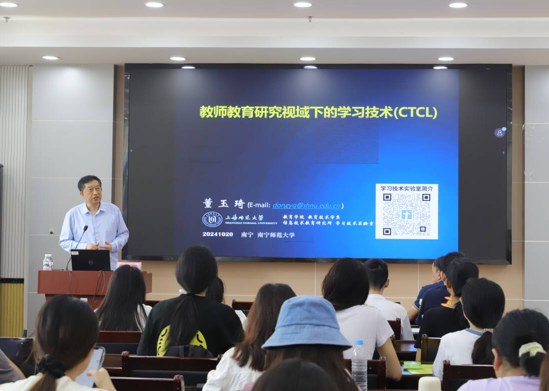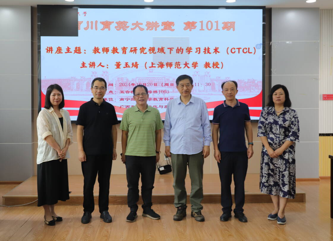 为拓宽师生对教师教育与学习技术的前沿知识视野,10月20日上午,由教育科学学院主办、广西教育现代化与质量监测研究中心承办的百川育英大讲堂系列第101期讲座顺利举行。本次学术活动邀请了上海师范大学董玉琦教授作题为《教师教育研究视域下的学习技术(CTCL)》的学术讲座,讲座由教育科学学院副院长徐延宇研究员主持。