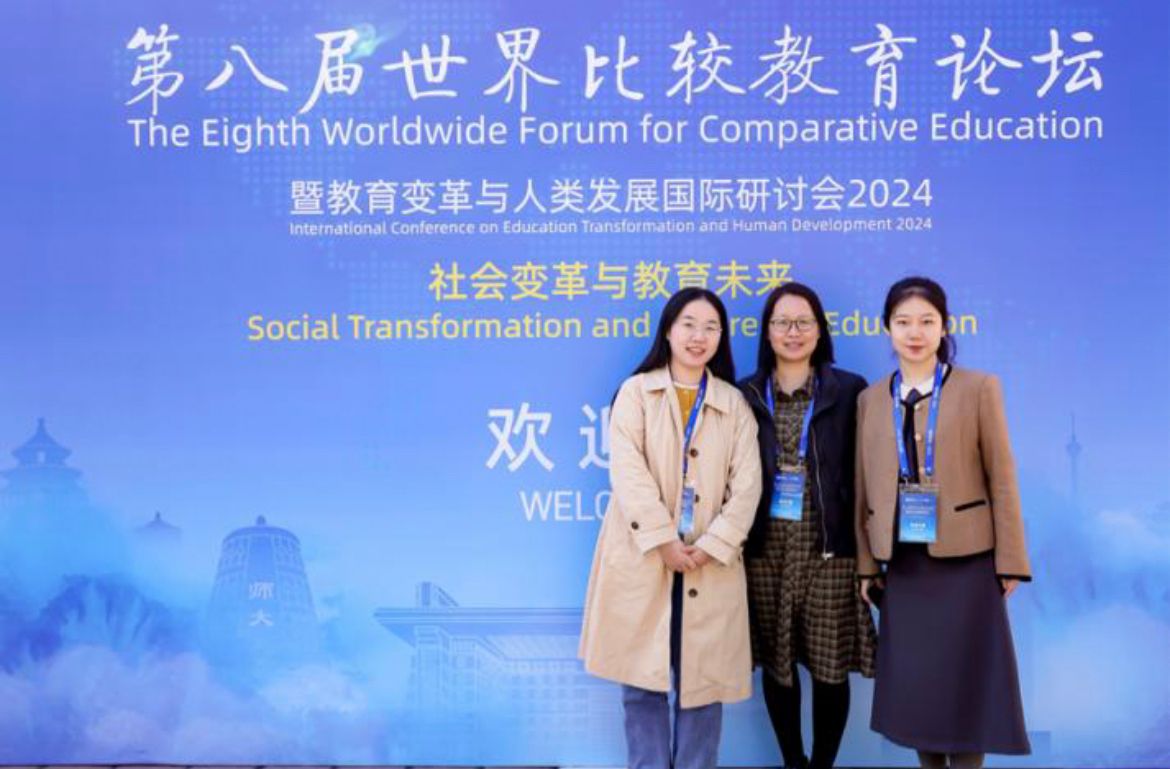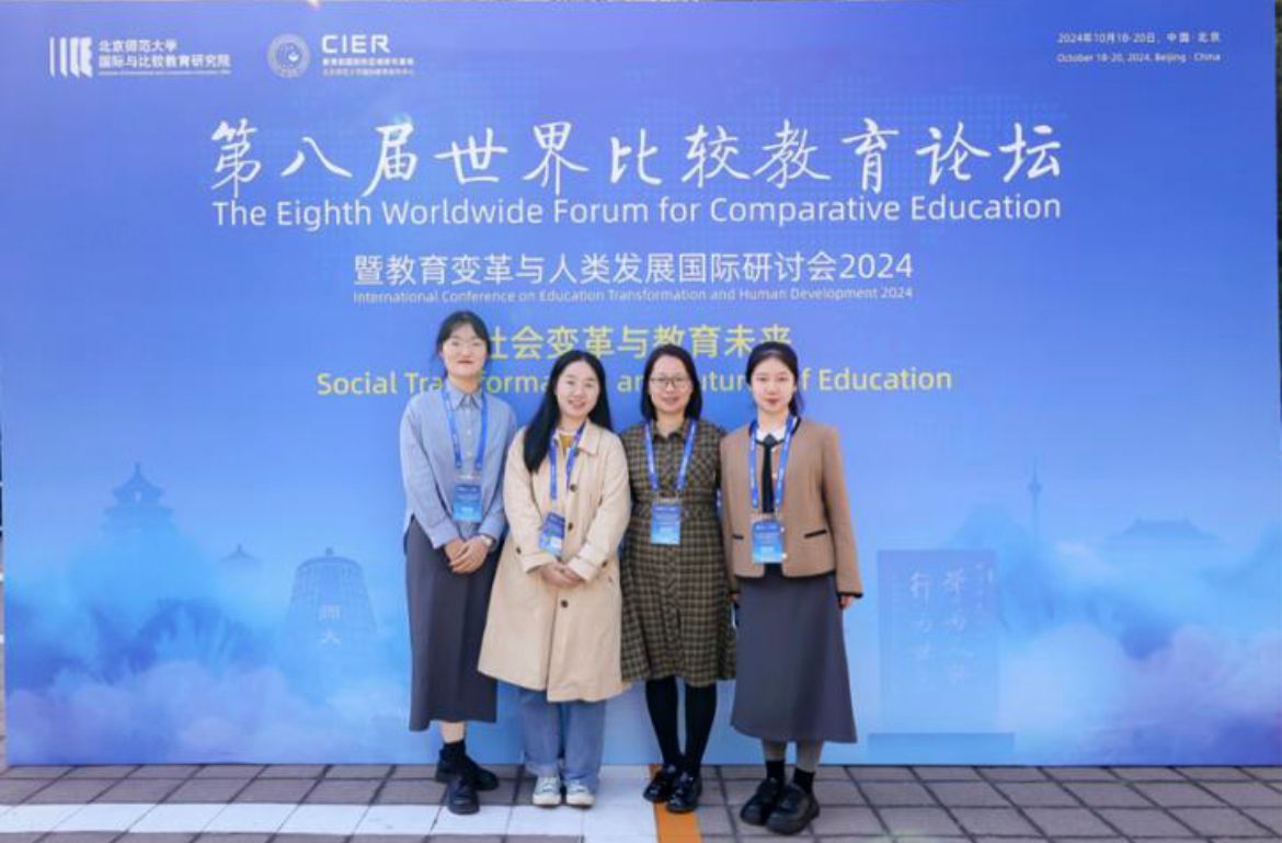 2024 年 10 月 18 日至 20 日,第八届世界比较教育论坛暨教育变革与人类发展国际研讨会在北京师范大学(海淀校区)召开。此次研讨会以“社会变革与教育未来”为主题,共设12 场主旨报告、2 场圆桌讨论、54 场平行论坛。与会代表分别来自中国、 美国、 英国、 日本、 德国、 保加利亚、 泰国、 柬埔寨、 孟加拉等 10 多个国家和地区。我院张清玲博士、硕士生朱方舟及陈越赴京参会,并在会议中作了精彩的汇报发言。我院 2021 级硕士毕业生何苗苗也在本次会议上进行了汇报发言。