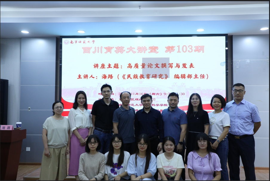 为强化师生教育科研领域能力素养、提升学术论文撰写水平、促进学术交流与发展,11月16日上午,教育科学学院在五合校区理综楼1003室举行百川育英大讲堂系列第103期讲座。此次讲座以“高质量论文撰写与发表”为主题,特邀《民族教育研究》编辑部海路主任主讲,讲座由教育科学学院副院长徐延宇研究员主持。