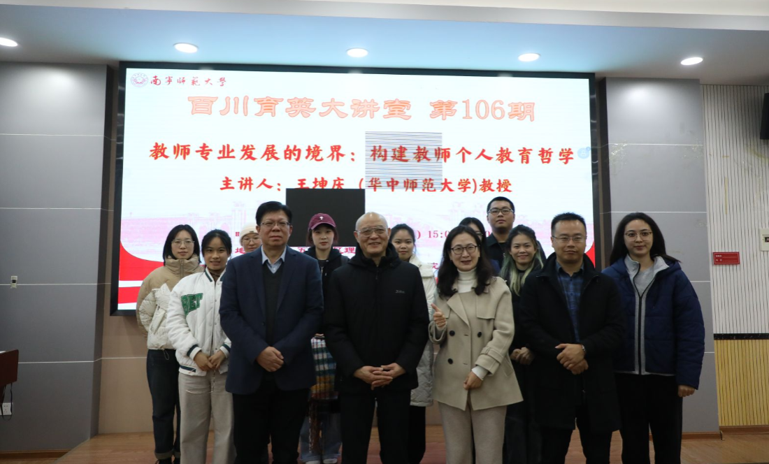 为大力弘扬教育家精神,助力师生拓展学术视野,12月27日下午,由教育科学学院基地、广西教育现代化与质量监测研究中心主办的百川育英大讲堂系列第106期讲座,于我校五合校区理综楼1003室举行。此次讲座特邀华中师范大学王坤庆教授以“教师专业发展的境界:构建教师个人教育哲学”为主题,由教育科学学院朱家安教授主持。