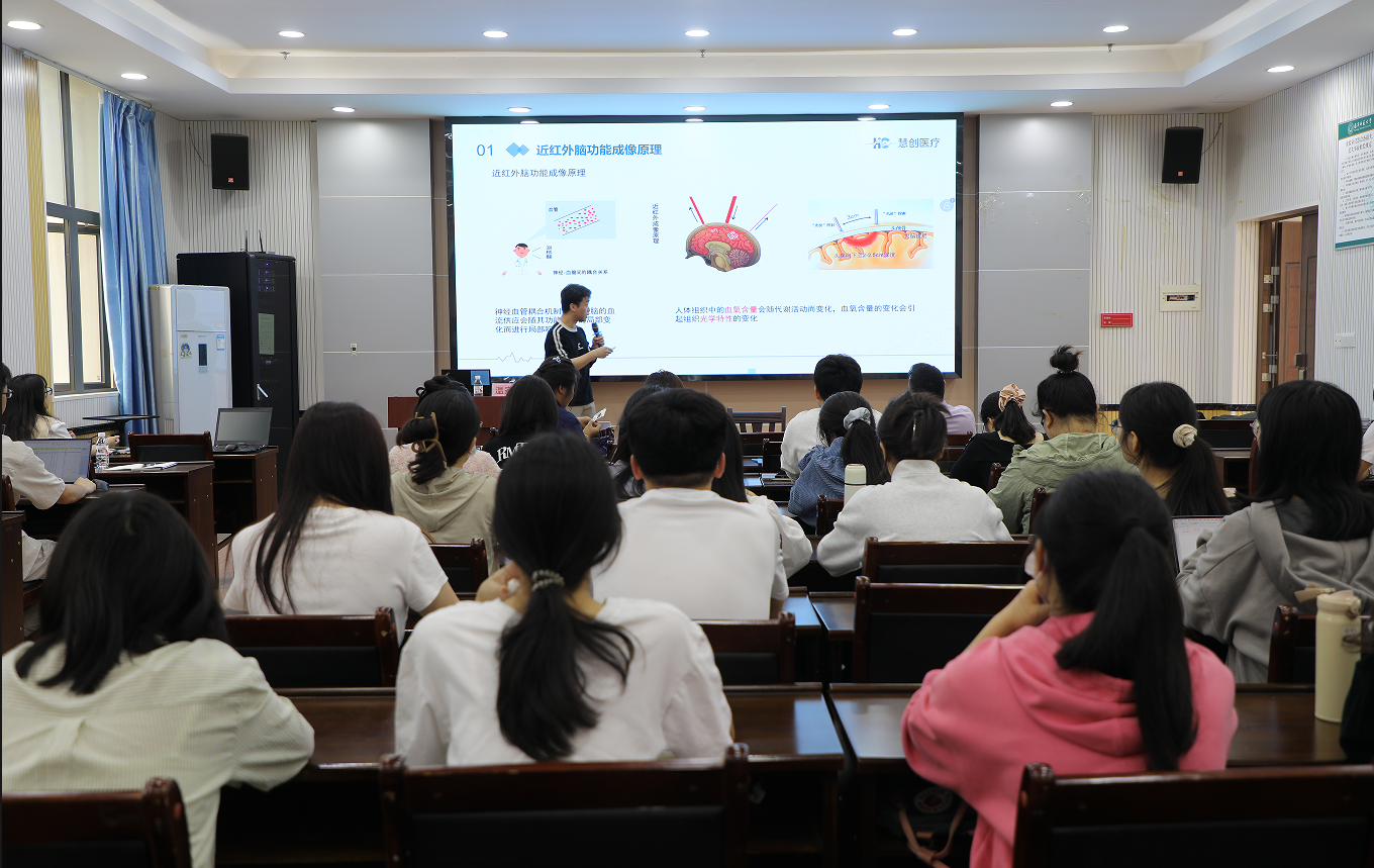 温家斌工程师从脑功能成像技术的发展脉络切入,详细阐述了fNIRS技术的原理,其设备利用特定波长的红外光穿透头皮和颅骨,照射大脑皮层,根据光的吸收和反射情况,精准捕捉大脑活动信息。温家斌着重介绍了慧创医疗fNIRS设备采用超微光检测技术和雪崩二极管,结合分时采集技术,有效避免通道间串扰,显著提升信号质量与数据准确性等独特优势。在应用案例分享环节,温家斌工程师展示了fNIRS技术在教育、医疗、运动等多领域的广泛应用。讲座过程中师生们积极提问,围绕fNIRS技术的测量精度、儿童研究应用、数据采集与分析等方面展开深入探讨,现场气氛热烈,交流氛围浓厚。