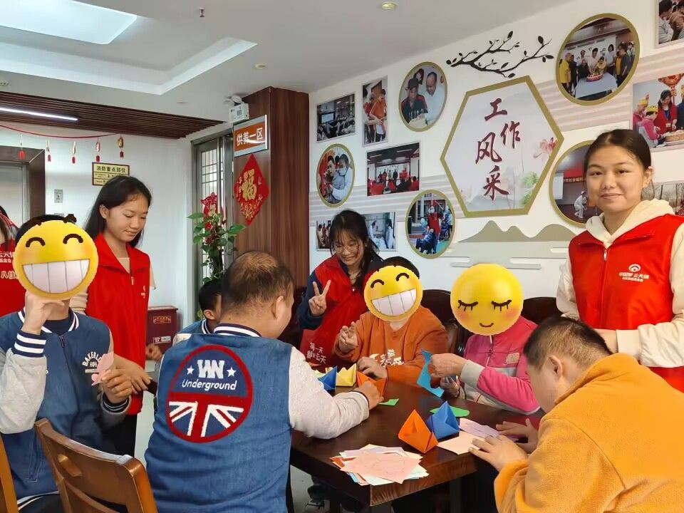 志愿者们到达后,与老人们嘘寒问暖,耐心倾听他们的故事,同他们聊天。随后,志愿者同老人们进行暖心游戏,大家一起剪纸,叠纸杯,写祝愿。在游戏的过程中,志愿者与老人们一起合作娱乐,老人们露出开心的笑容。最后,大家一起拍照留念,让时光定格在这一刻。