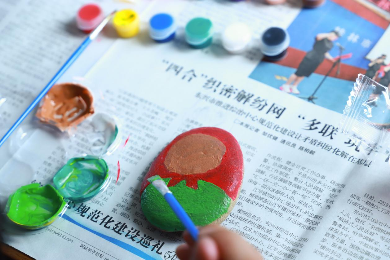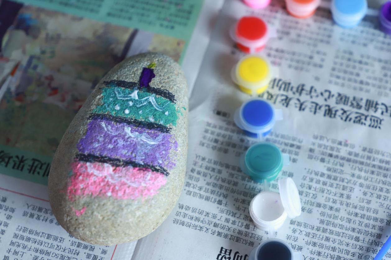在成果展示环节,大家小心翼翼地捧着自己的 “石头艺术品”,向老师和同伴们介绍创作思路:“我画的是蛋糕,因为我喜欢吃蛋糕”“这颗石头像粽子,所以我画了粽子”“我把喜欢的图案 组合在一起,觉得这样很有趣”……