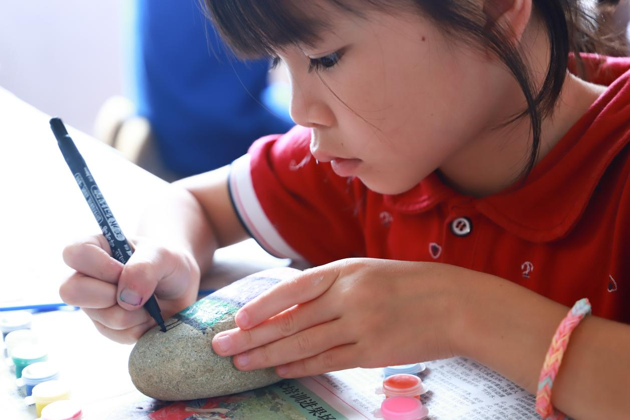 随后便正式进入石头绘画的创作阶段。同学们专注地调色,细致地勾勒线条,也会举手向老师请教细节处理方法。志愿者老师和指导教师穿梭在同学们中间,随时为同学们提供帮助、调试颜料浓度,鼓励内向的同学大胆表达自己的想法。整个创作过程充满了专注与活力,原本普通的石头在同学们的巧手下渐渐焕发出别样的光彩。
