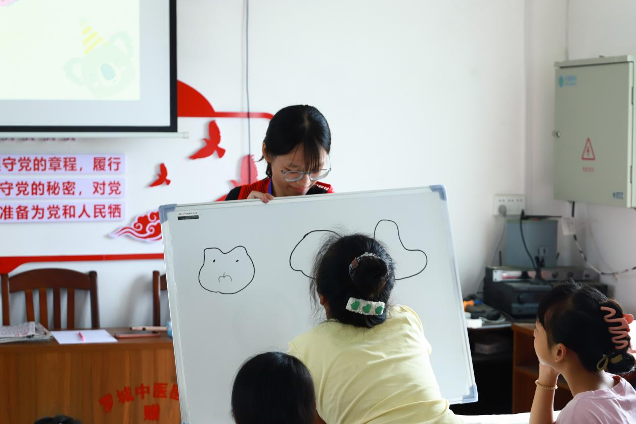 绘画活动开始前,指导老师先支起小白板,为同学们细细拆解石头绘画的基础技法:从如何巧借鹅卵石的天然弧度铺陈构图,让图案与石形浑然相融、相映成趣;到如何调配色彩,让画面在和谐统一中透着灵动生气,都讲得浅显易懂。讲解毕,老师邀请大家在白板上落笔试画,在预设的简单轮廓里,有人添上细碎的星点,有人勾出飘逸的弧线,有人缀以俏皮的几何图形……短短几笔,笔触或轻或重,构想各有巧思,已然显露出蓬勃的创作个性。