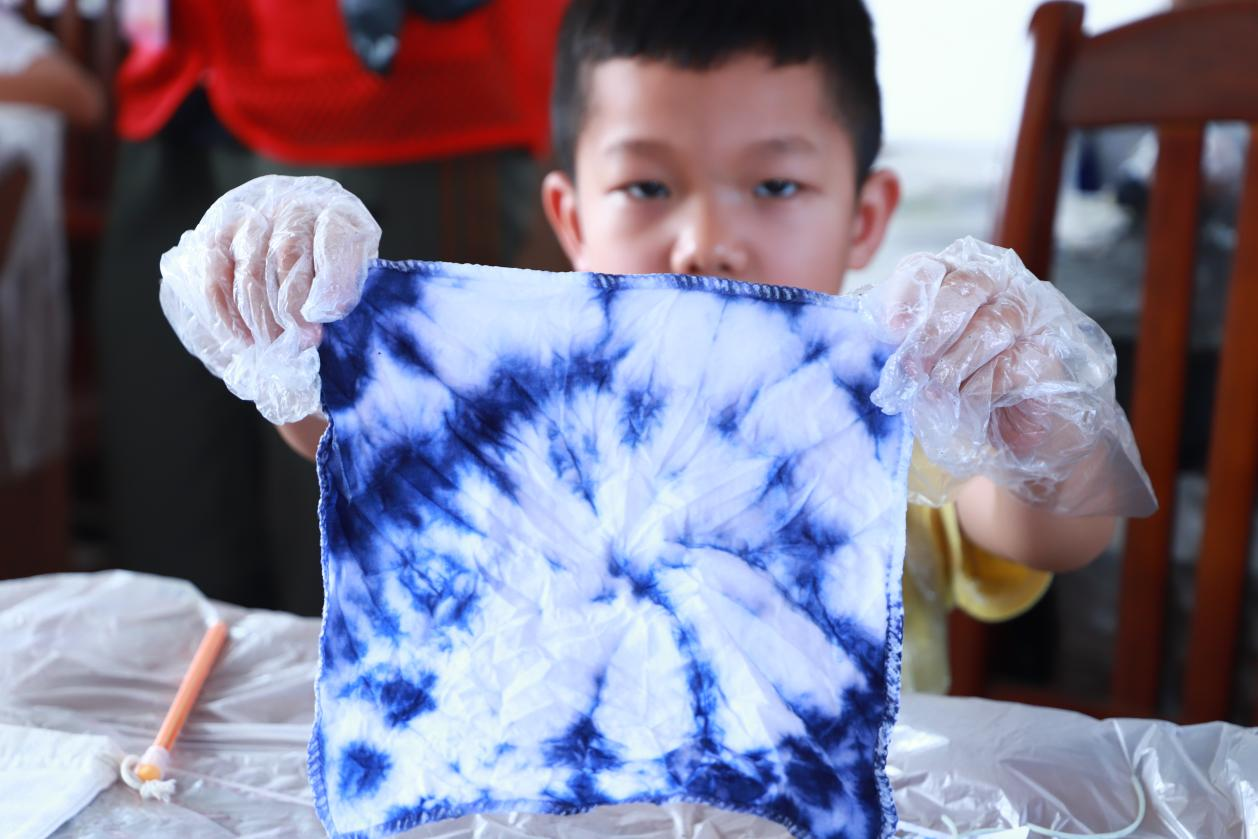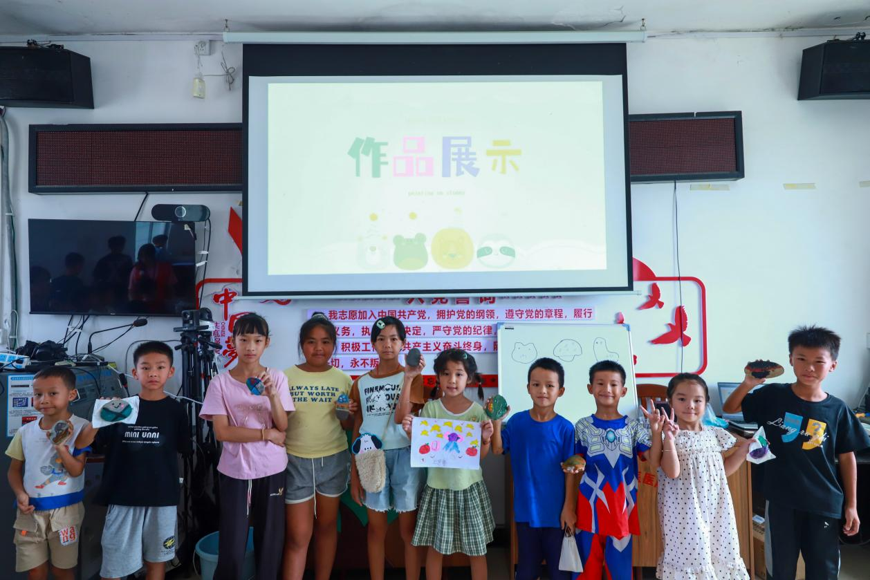 迎着清晨的阳光,天宝村及周围村落的25名学生陆续来到天宝村村委会议室参加夏令营活动。在非遗扎染体验手工课上,志愿者播放教学短片并进行现场示范后,为孩子们系上围兜、分发材料。折叠、扎结、浸染、拆线……当纯白的手帕与束口袋通过颜料晕染出独一无二的图案时,现场响起阵阵惊叹。石头绘画课上,实践队员支起小白板,让同学们在白板上设计要在石头上绘画的图案,再将鹅卵石、五颜六色的颜料、粗细不一的画笔等材料有序分发给每位同学。学生们专注地绘制着,以鹅卵石为画布,用画笔描绘自然与想象。
