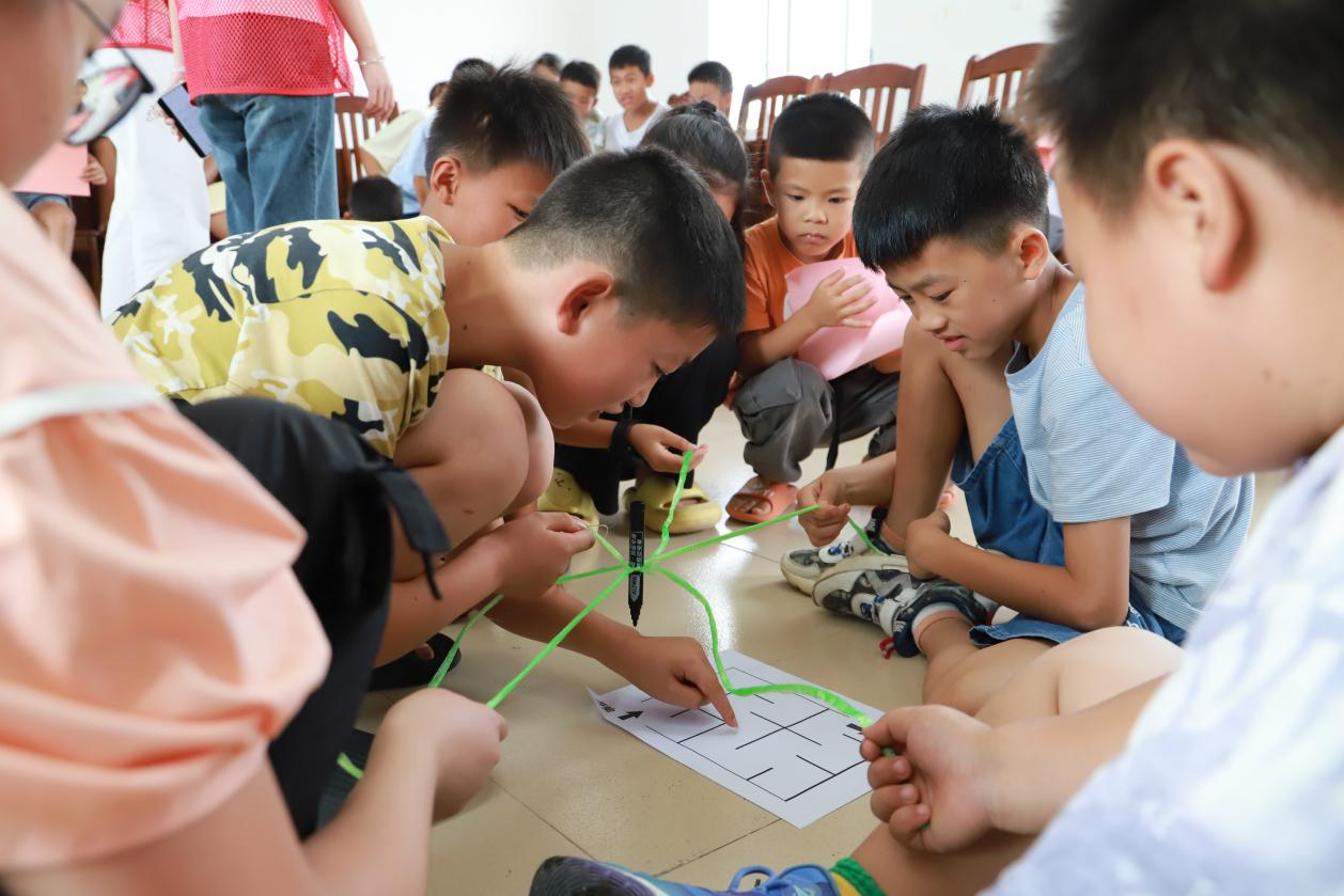 随后进行的《广西地理里的美丽密码》地理鉴赏课,志愿者借助AI航拍视频带孩子们俯瞰漓江、德天瀑布、龙脊梯田。“原来广西这么美!”孩子们惊叹连连,纷纷谈起自己眼中的广西是怎样的。在拼图环节,小组合作复原广西地理景色。游戏结束,志愿者引导孩子们用一句话描述家乡,孩子们不断告诉着老师自己对家乡广西的看法。针对农村儿童常见的孤独、焦虑情绪,实践队设计了以“在合作中成长”为主题的团辅游戏活动。同学们分成红色队、溶洞队、西风骑士团和菜但爱玩小分队四个小队参与老师设计的游戏,在游戏中相互合作、累计积分,在共同游戏的过程感受到合作的乐趣。