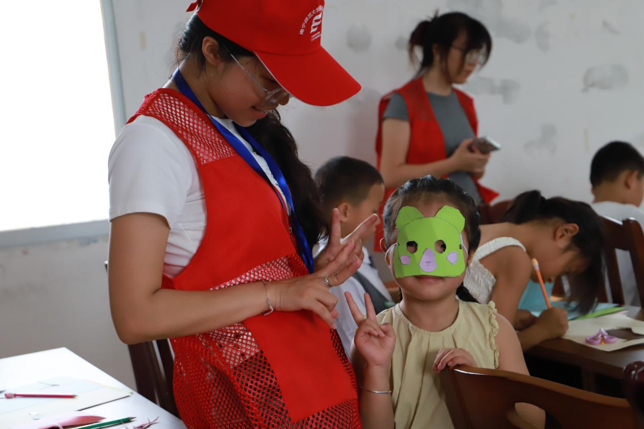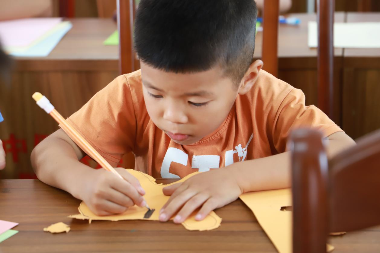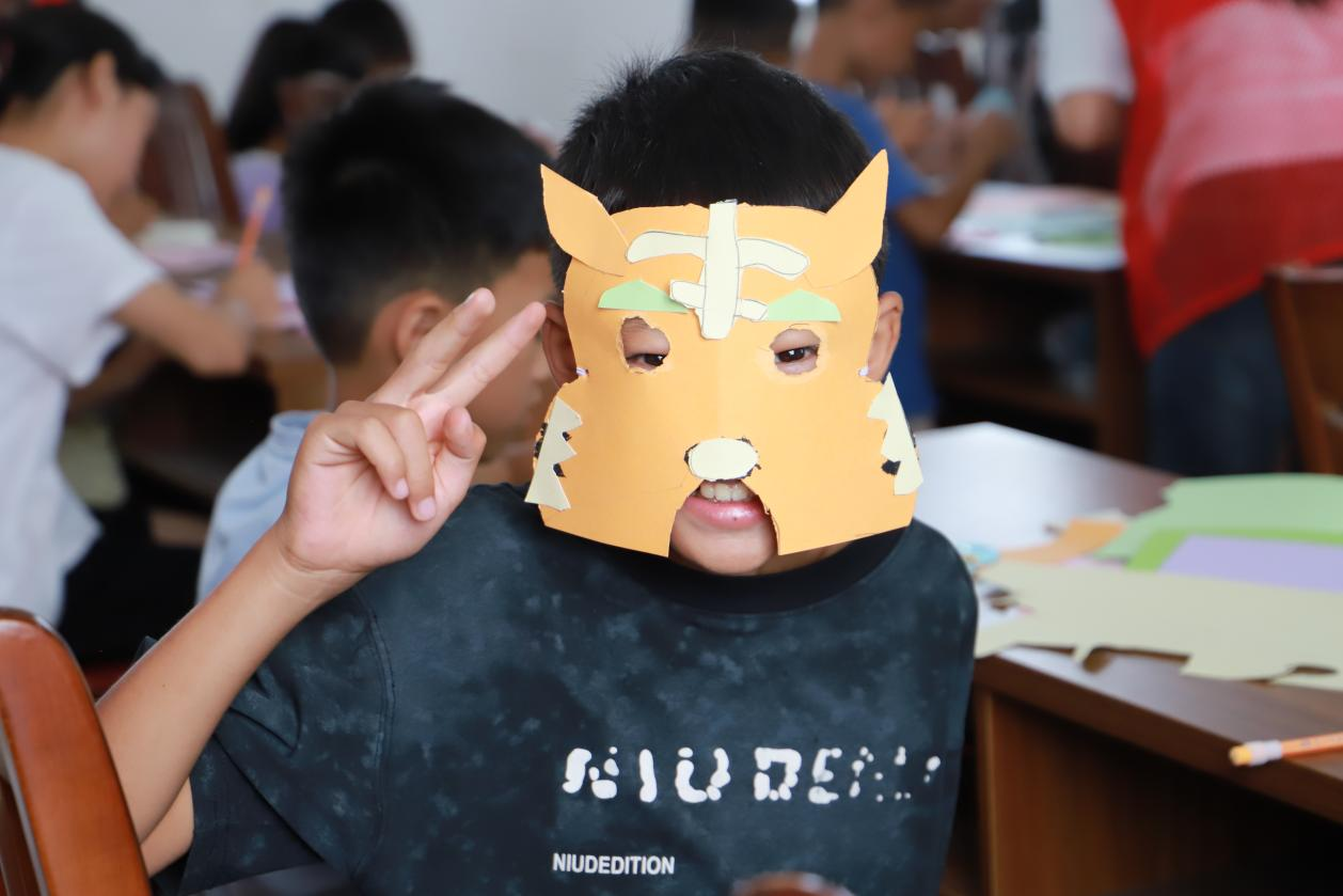 一来到天宝村村委会议室,夏令营星火班的学生们就在老师的指引下开始了一堂趣味横生的动物面具手工课。志愿者以“你喜欢的小动物”破冰,引出动物面具手工课。孩子们在卡纸上描形、裁剪、拼贴,不一会儿,憨态可掬的小熊、活泼可爱的小兔、威风凛凛的大老虎跃然眼前。戴上亲手制作的面具,孩子们兴奋合影,“我把最喜欢的动物‘戴’在脸上啦!”