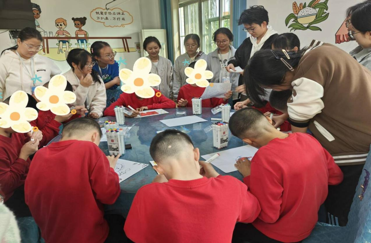 教育科学学院的志愿者们协助孩子们进行色彩绘画游戏,营造温馨、积极的氛围。志愿者们带领孩子们进行投壶小游戏和抢凳子趣味游戏,锻炼了孩子的反应能力和身体协调性。在互动游戏环节,孩子们通过套圈小游戏获得了小礼品,增强了自信心和自我价值感。
