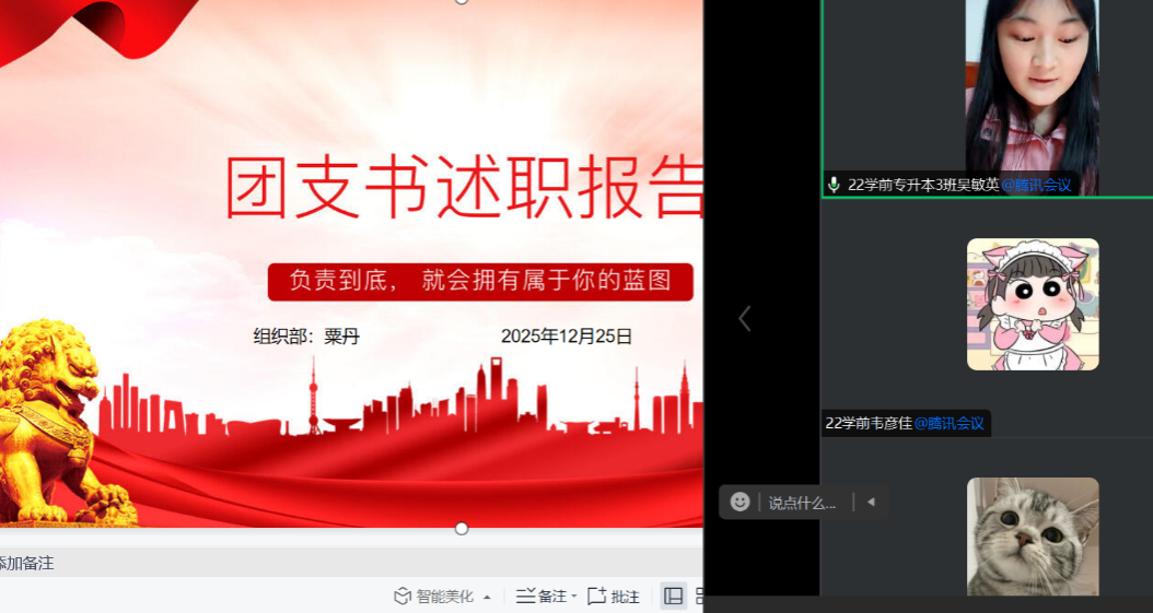 12月25日晚,教育科学学院团委开展了2025-2026学年秋季学期团支书述职大会,本次大会通过腾讯会议平台进行。会议的第一环节由各班团支书依次进行述职发言,各班团支书通过PPT等形式,展现了各团支部在组织建设、思想引领、服务青年、特色活动等方面的工作成效。会议第二个环节由各班团支书进行经验交流,大家相互借鉴、互相学习,寻找自身的不足和对照优秀团支部学习。