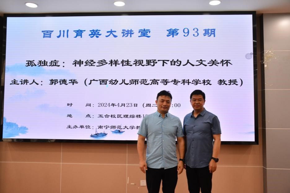 为提高对孤独症儿童康复教育的认识,增进师生对孤独症儿童的关注和理解,提升师生的专业素养,4月23日下午,教育科学学院于五合校区理综楼1003室举办了第93期《百川育英大讲堂》活动,本次学术活动邀请了广西幼儿师范高等专科学校郭德华教授作题为《孤独症:神经多样性视野下的人文关怀》的学术报告,讲座由教育科学学院院长助理颜志雄教授主持。