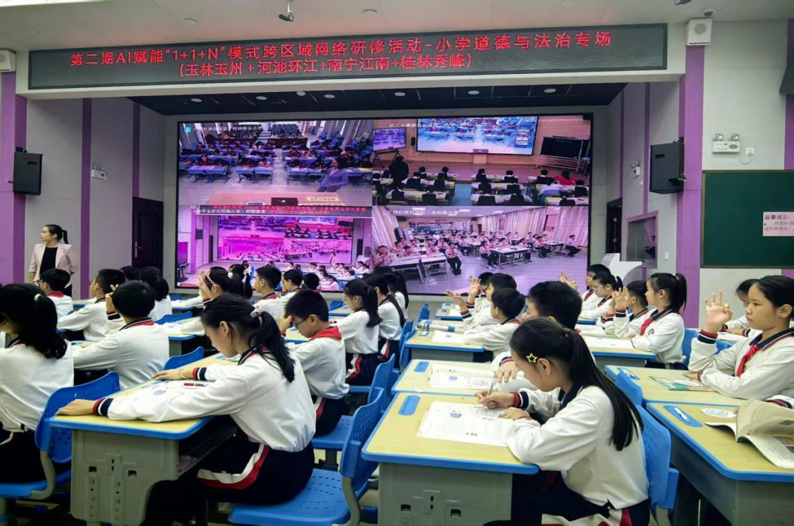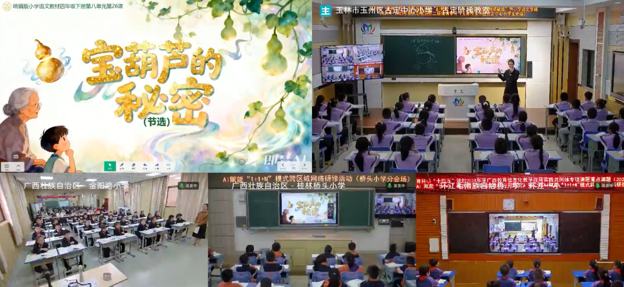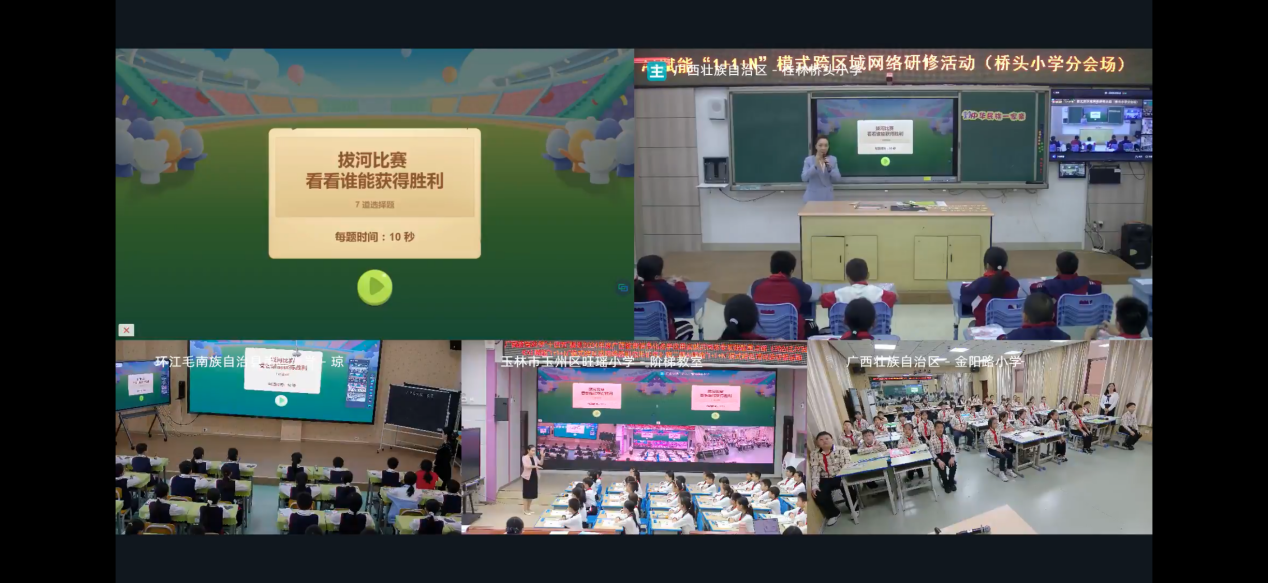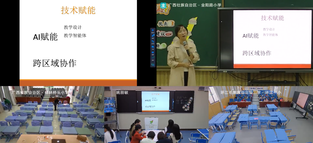 活动于10月23日上午由环江毛南族自治县第一小学作为授课主讲端进行小学数学的课例展示,下午由玉林市玉州区古定中心小学作为授课主讲端进行小学语文的课例展示,10月30日上午由南宁市金阳路小学作为授课主讲端进行小学心理健康的课例展示,下午由桂林市秀峰区桥头小学作为授课主讲端进行小学思政、小学美术的课例展示。四地小学教师聚焦数学、语文、心理健康、思政、美术共5节课5个学科,通过云端集体备课打磨课例、课例展示、组织学生云端参与课堂互动,不仅展示了AI技术与各学科教学相融合的阶段性成果,也改进了传统教育在时间和空间上的束缚。课例展示结束后,四地教师借助云端实时共享技术,围绕学生学科核心素养的提高和AI技术与学科教学紧密融合等方面对展示的课例进行点评。