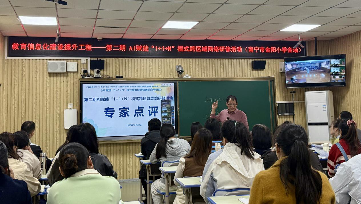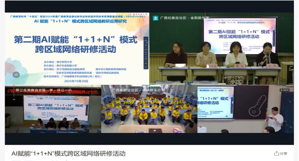 为推动区域间教育交流和优质教育资源共享,提升教师数字化技能与信息素养,推动科研项目研究成果的实践与服务基础教育,由必威西汉姆联官网教育科学学院余朝文教授主持的“AI赋能‘1+1+N’模式跨区域网络教研应用研究”项目,于10月23日和10月30日开展了第二期网络研修活动,本次活动通过“1个主讲端课堂+3个听讲端课堂”的“1+N专递课堂”形式开展课前异地网络集体备课磨课、云端同步授课、四地学生听课互动、四地教师评课研讨、专家评课及专业微讲座等环节,深入研讨AI在学科教学中的实际应用路径,实现了跨区域间的教学沟通与协作。