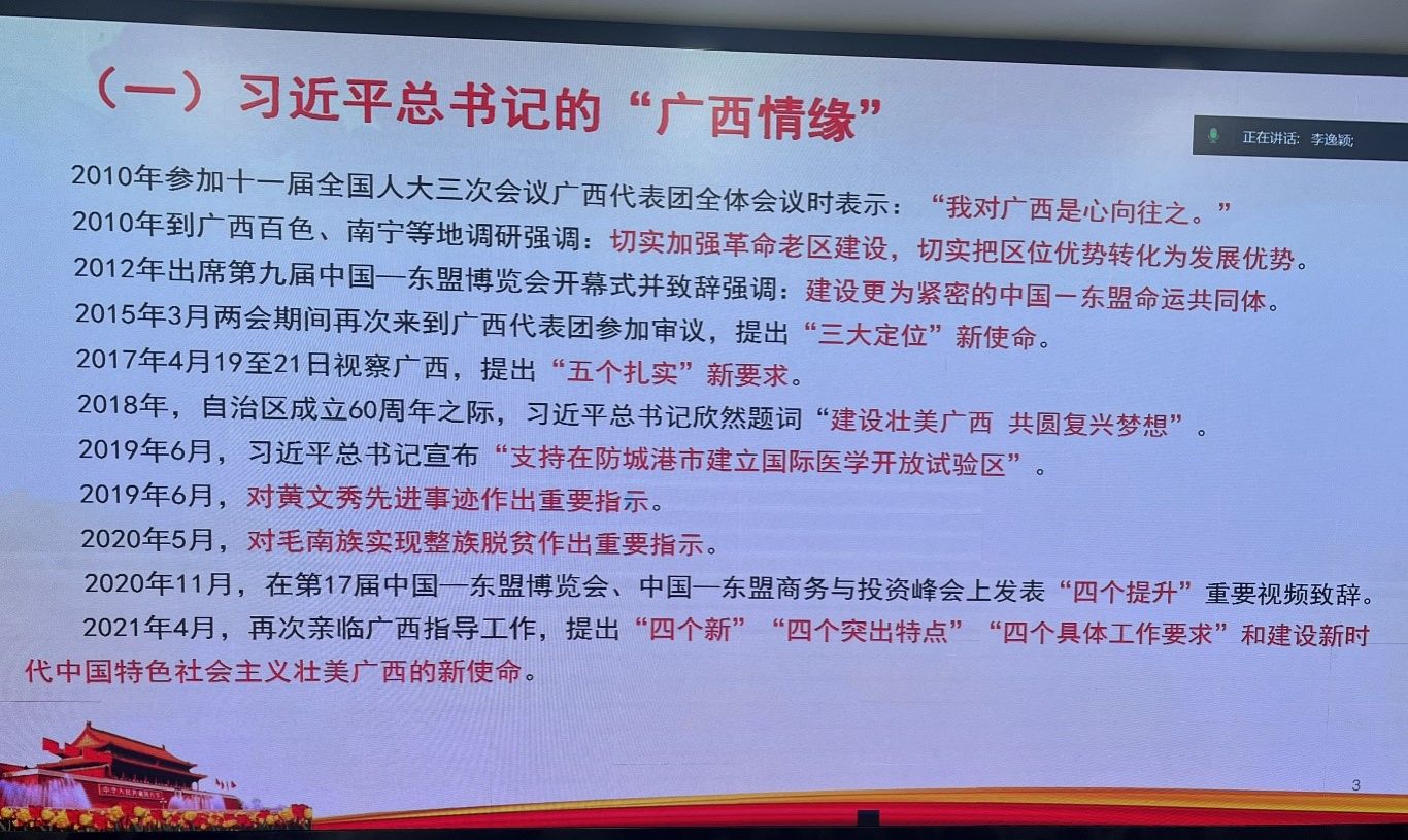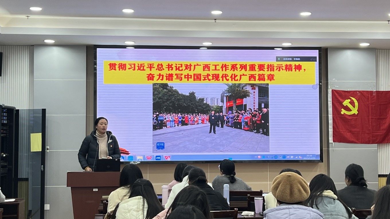 为学习好、宣传好、贯彻好习近平总书记视察广西重要讲话精神,2023年12月25日晚上,教育科学学院党委谢珊副书记在五合理综1003室为学院研究生第一党支部讲授主题为“贯彻习近平总书记对广西工作系列重要指示精神,奋力谱写中国式现代化广西篇章”专题党课,该支部全体党员和入党积极分子参加了学习。