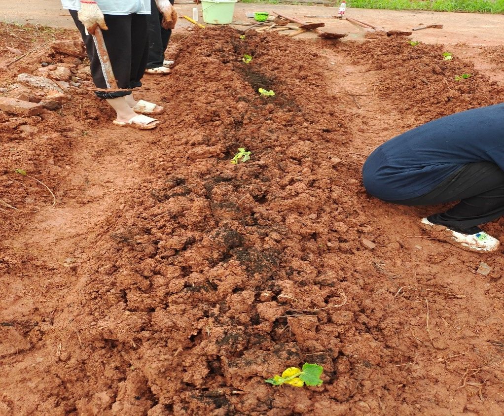 4月20日下午,劳动实践拉开序幕。炎炎烈日下,参与实践的同志们“全副武装”,身穿防晒衣,手拿锄头,或蹲在草丛里拔草,或弯着脊背翻土,阳光倾洒在他们朝气蓬勃的脸庞上,汗水滴落在他们脚下的土地上。随着夕阳的落下,当日的劳作任务也初步完成,大家看着原本满是杂草的荒地被翻新成可以栽种的耕地,满是泥泞通红的脸上绽放着灿烂的笑容。4月21日下午,参与劳动实践的本科生第一党支部的同志们撸起袖子,互相配合,共同开启当日的劳动实践。大家干劲十足,分工合作地进行着挖沟起垄、移栽瓜苗的劳作。纵使空中飘起小雨,即便鞋子满是泥泞,但是大家不喊苦不喊累、用自身面朝黄土背朝天的实际劳作向他人诠释青春的力量!直到最后一颗瓜苗被种进土地里,有关劳动的种子也被播种在大家的心田。