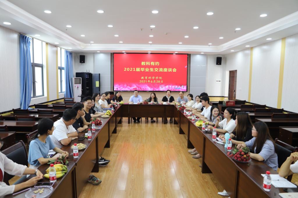 6月28日,教育科学学院在五合校区理综楼1003会议室举行以“教科有约”为主题的2021届毕业生交流座谈会。学院党委庞芳书记、李强院长、张瑞副院长、徐延宇副院长、学工办老师以及2021届毕业研究生、本科生、毕业生党员代表参加了座谈会。座谈会由谢珊副书记主持。